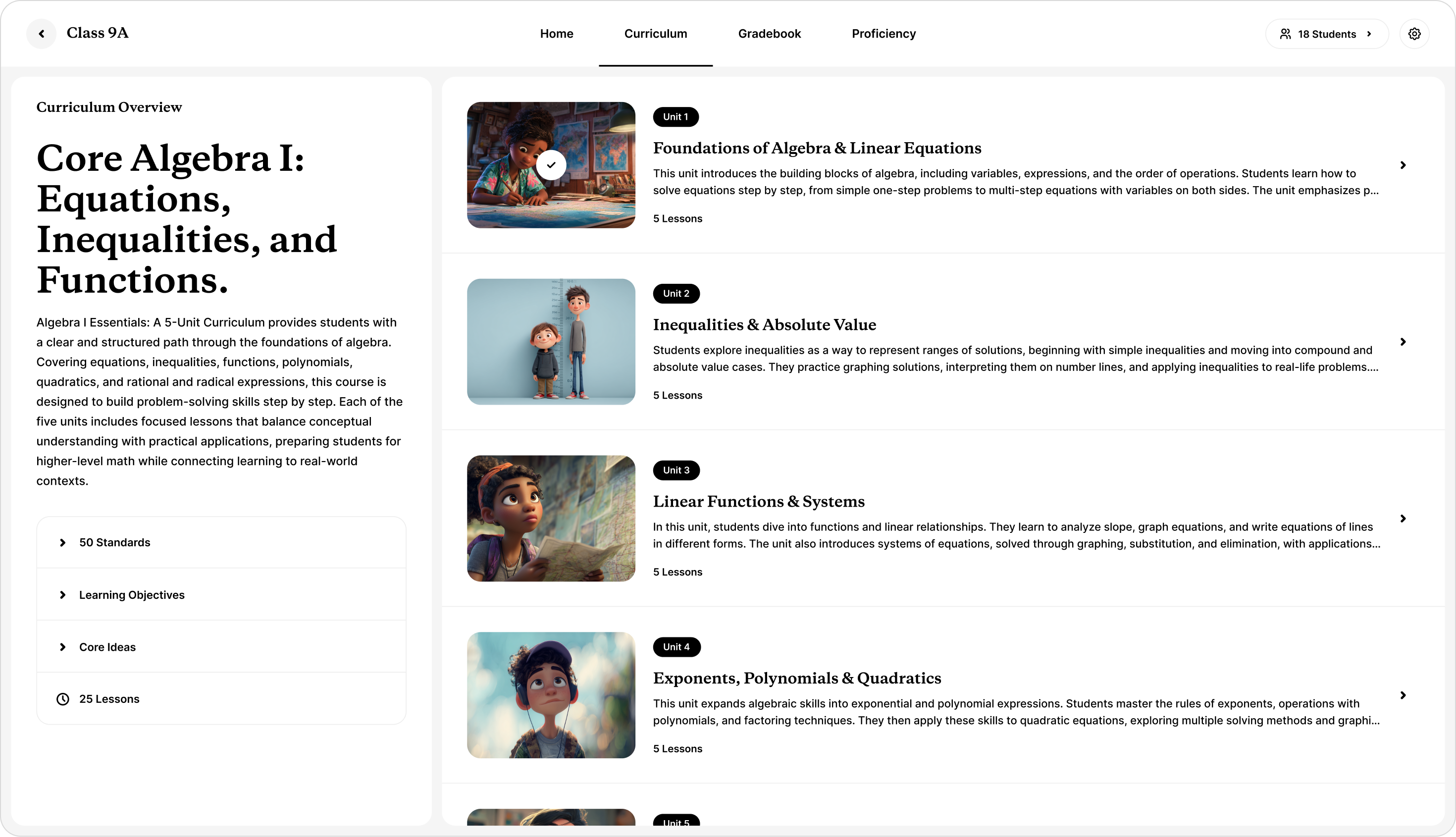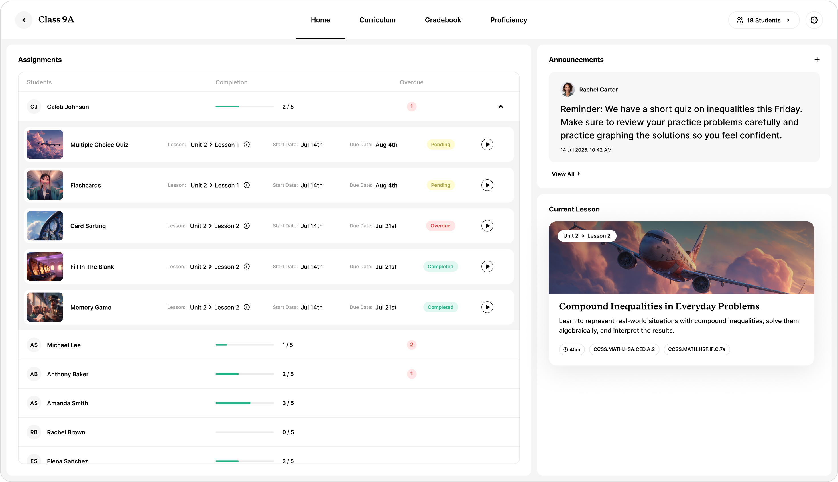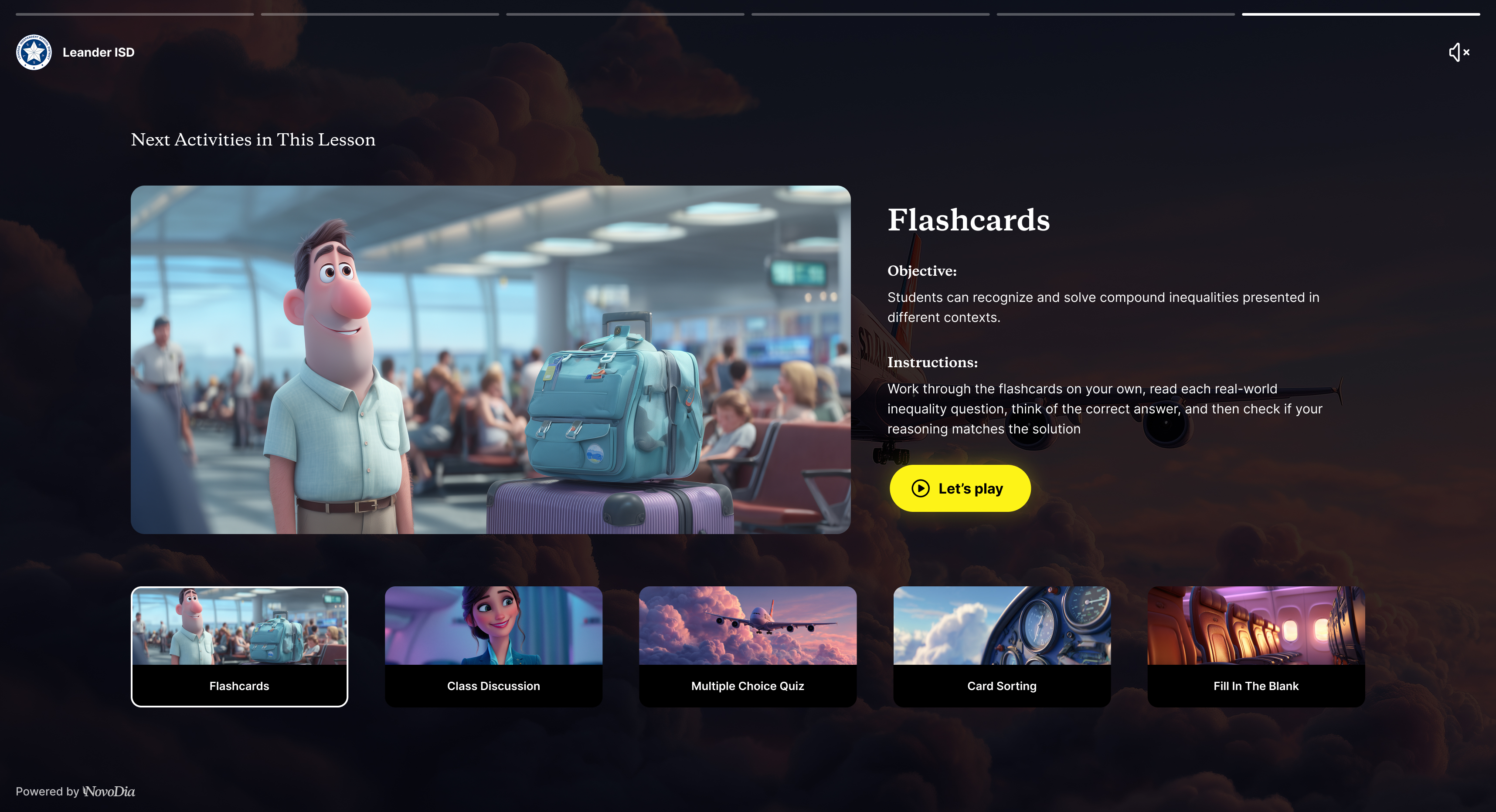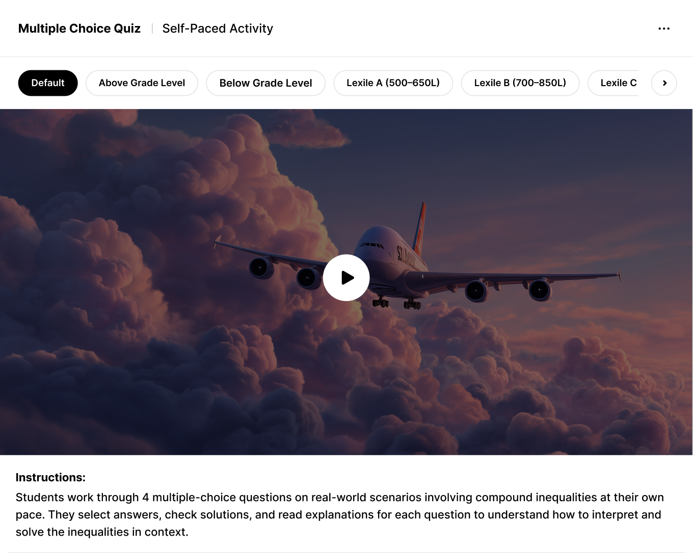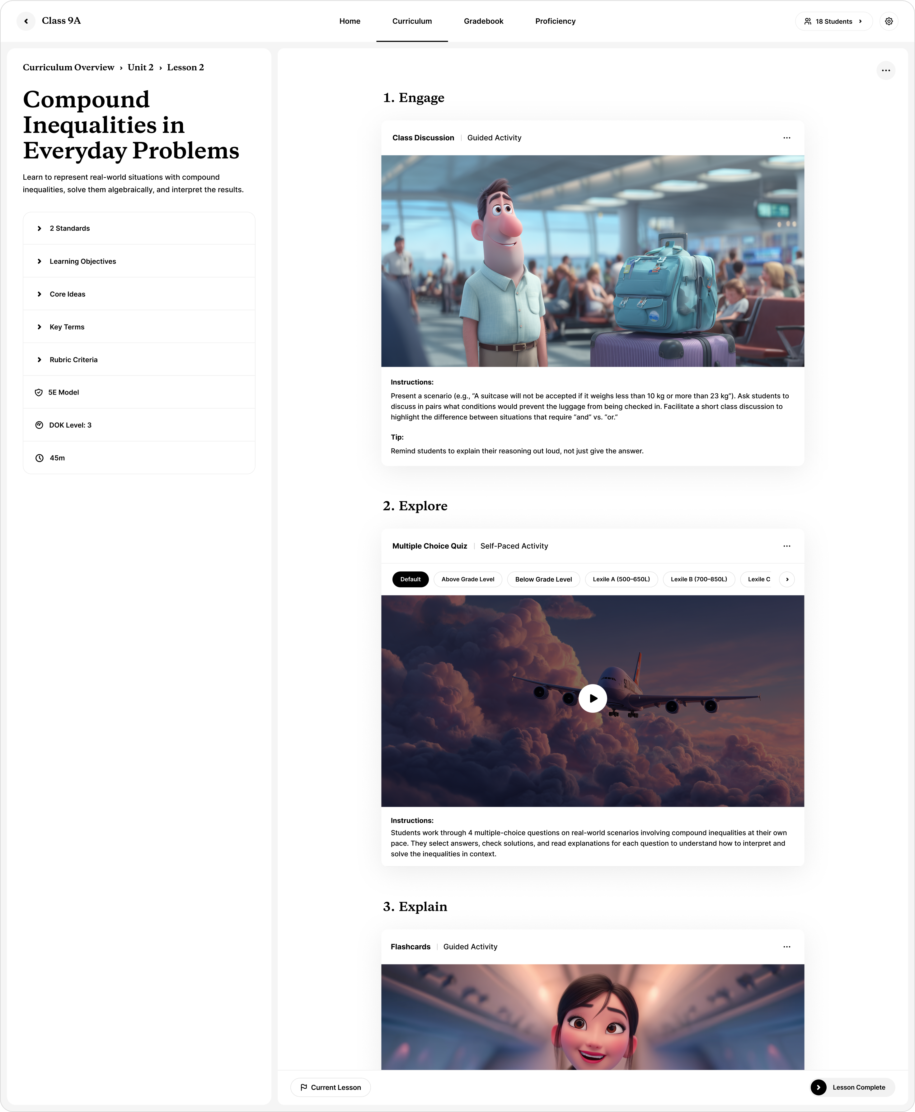 The lesson view gives teachers easy access to all lesson content in one place. It allows the teacher to quickly review and prepare for each class while ensuring students can access the materials seamlessly. Each activity comes with multiple variations—such as above-grade-level, below-grade-level, or different languages—so lessons can be tailored to meet every student’s individual needs. Teachers can assign specific activities and variations to particular students, giving them precise control over how content is delivered and ensuring that every learner is engaged and supported effectively.