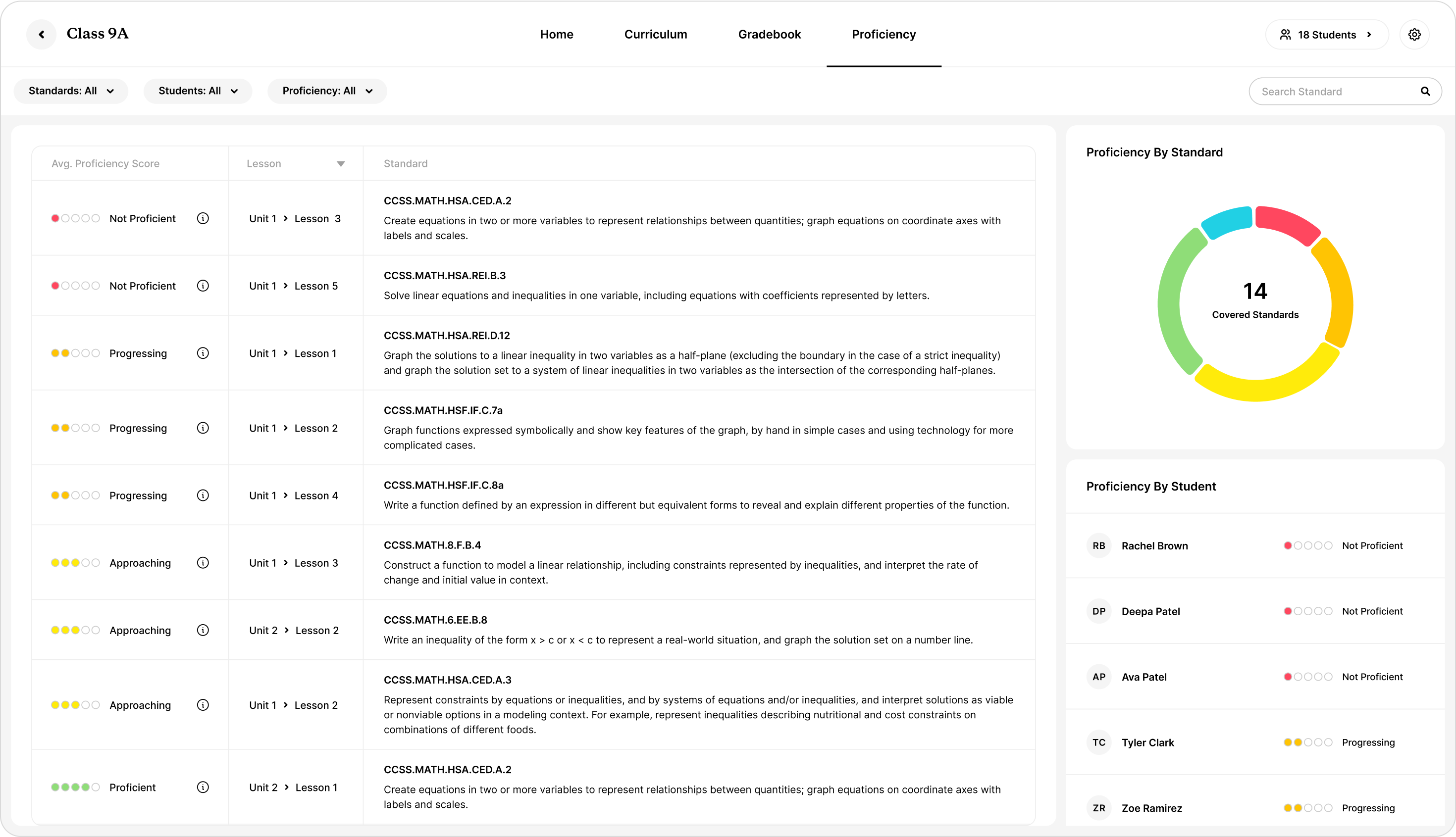 The LMS provides a comprehensive view for teachers to understand and track the performance of their students. It offers a detailed breakdown of proficiency scores for each standard covered in the course, allowing educators to see both overall trends and individual student progress. This view helps teachers identify areas of strength and areas needing improvement, tailor instruction to meet specific needs, and make informed decisions to support learning and improve outcomes across the class.