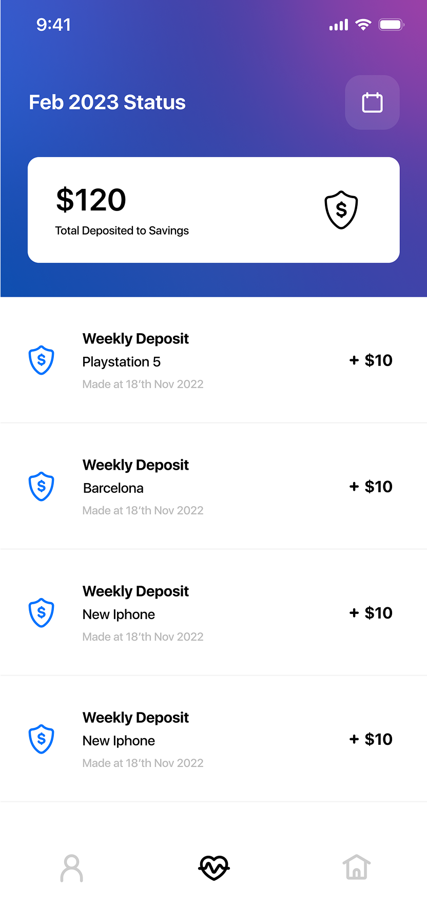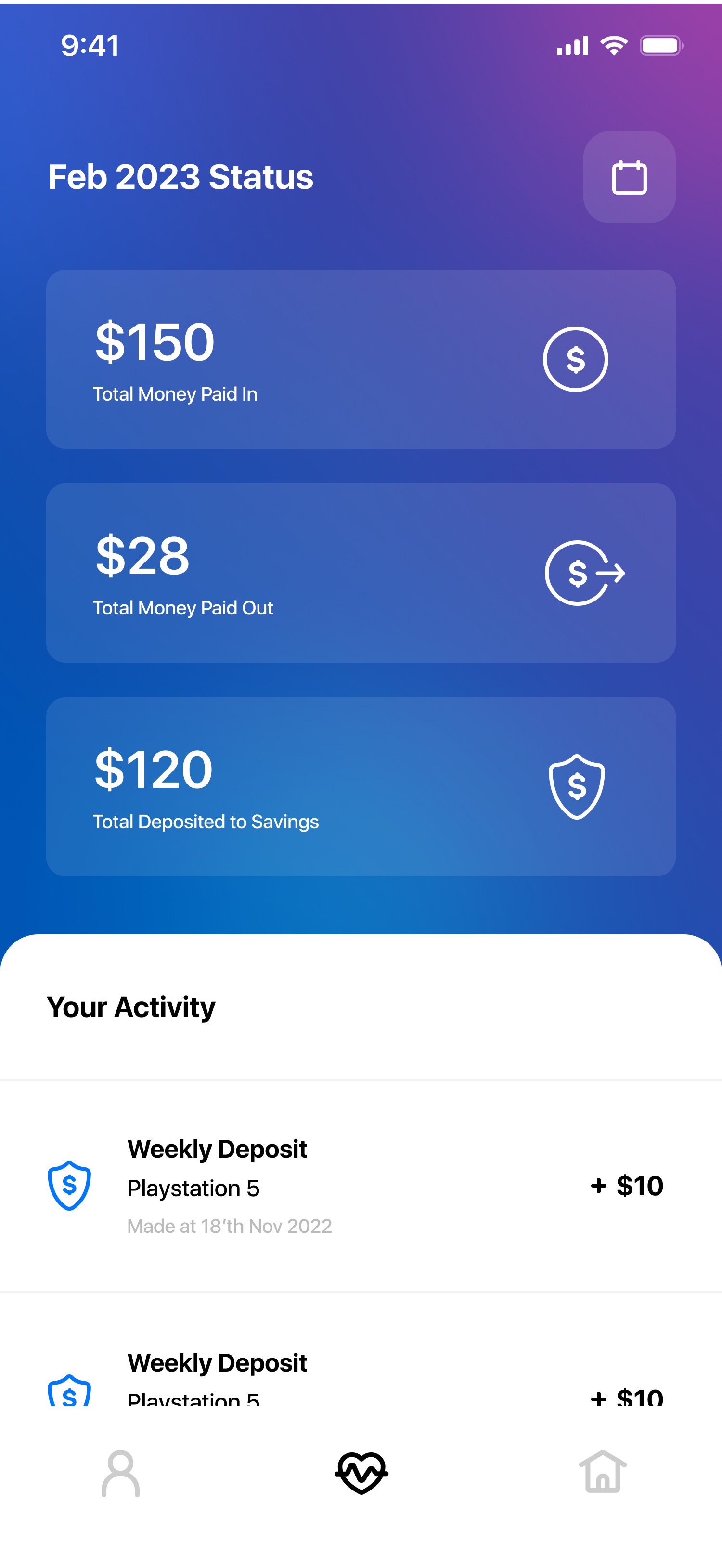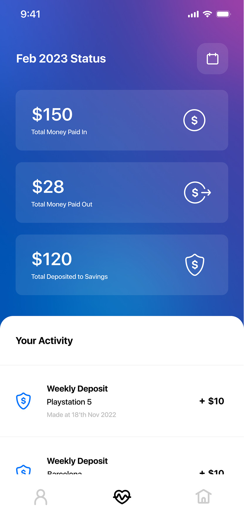 The Status area provides the user with a quick overview of their finances, displaying key numbers such as total money received, spent and deposited to savings. Users can also view a detailed list of all transactions, with filters to easily sort and find specific entries. This design helps the user stay organized and keep track of their financial activity at a glance, ensuring they have full visibility over their money and progress toward their goals.