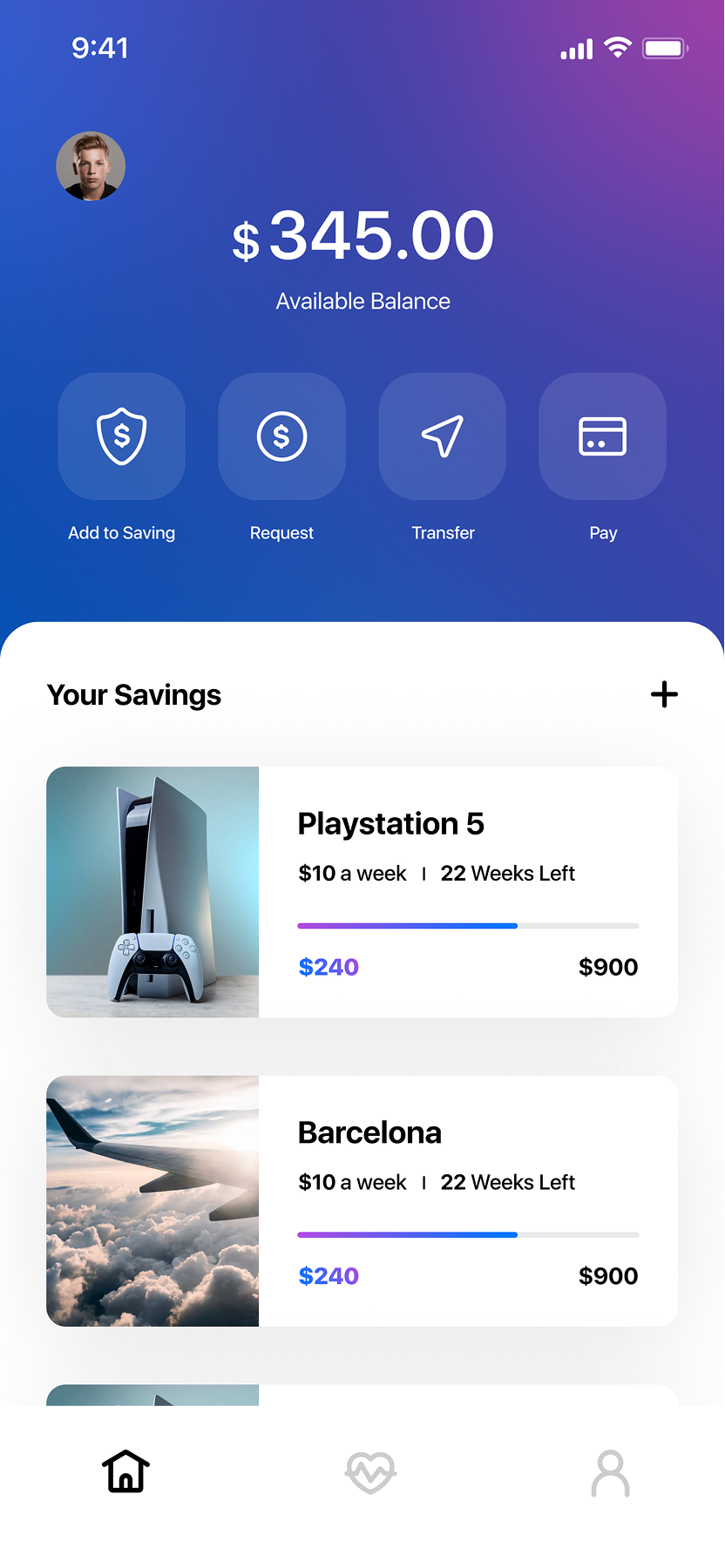 The home screen provides the user with easy access to all key actions,. While regular actions like sending money, requesting funds, making payments, or adding to a savings plan are immediately accessible, the saving section takes up the most space on the screen, emphasizing its importance. This design encourages users to set and stay on track with their saving goals while keeping all essential financial actions within reach