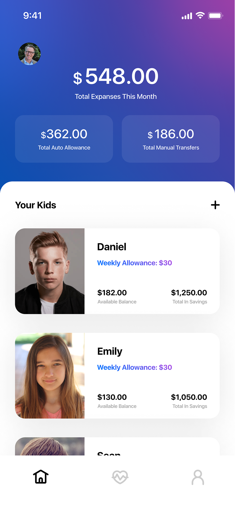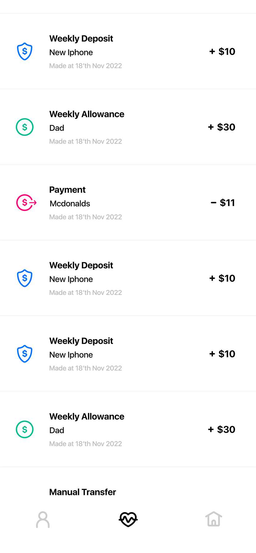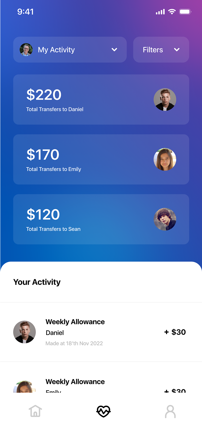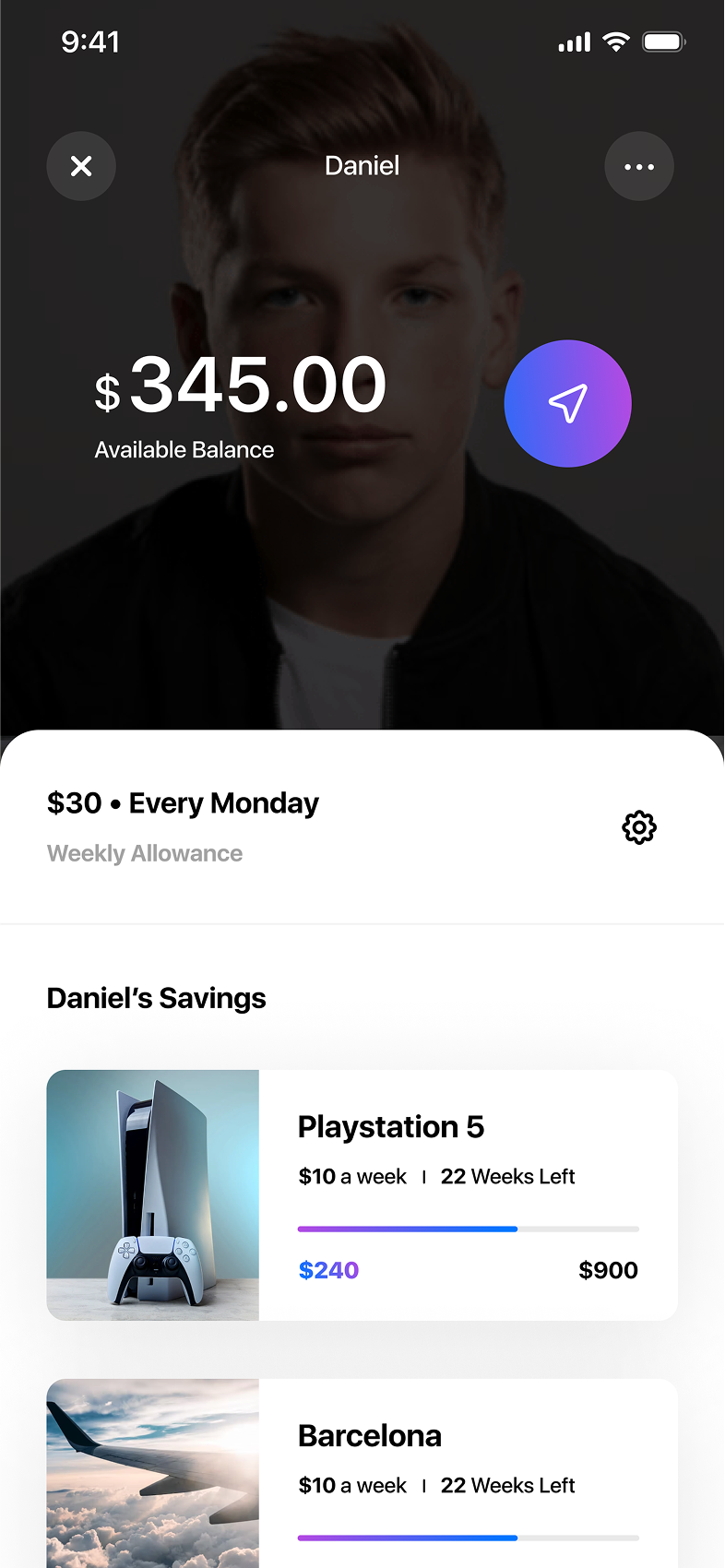 The parent side of the app allows parents to manage their children’s finances easily. Parents can view their kids, send money, and track how much each child has received. They also have full visibility into each child’s financial activity, including savings plans and progress toward goals. To make allowance management easy, parents can set up automatic recurring transfers, such as sending a fixed amount weekly, ensuring their children receive money consistently without any extra effort.